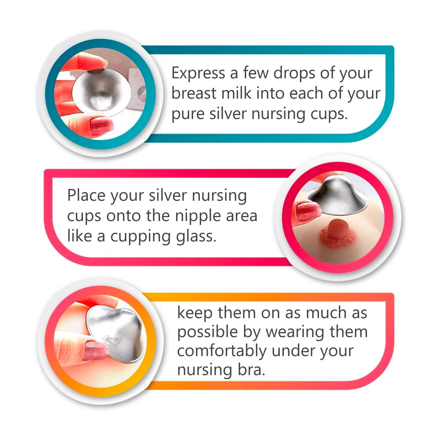 Изготовлены из 100% чистого серебра 999 пробы или высококачественного серебра 925 пробы, эти чашечки для кормления грудью - оригинальное, клинически проверенное решение для успокоения и заживления болезненных, потрескавшихся сосков во время грудного вскармливания. В отличие от одноразовых прокладок или силиконовых накладок, они используют природные антимикробные, противовоспалительные и заживляющие свойства серебра для мгновенного облегчения и ускорения восстановления. Многоразовые, экологически чистые и разработанные для длительного комфорта, они являются обязательным атрибутом в наборе для каждой кормящей матери.